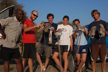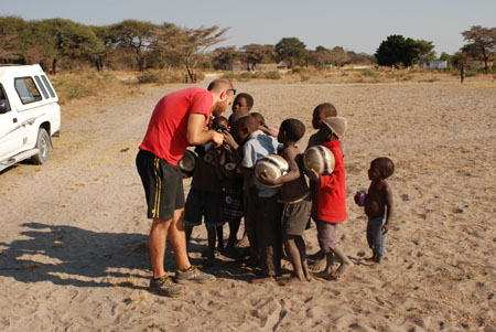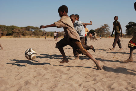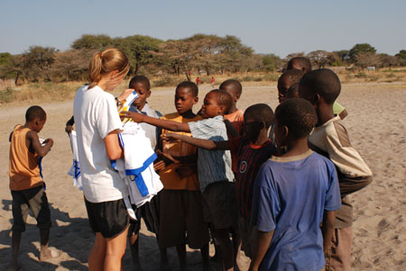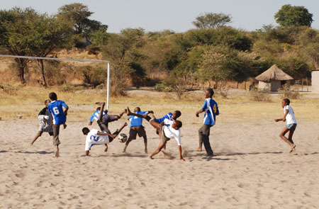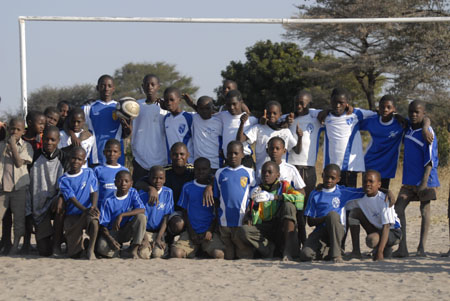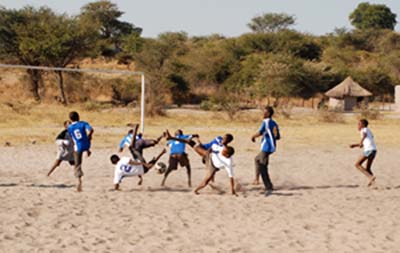 All the kids stayed a distance from where we stopped the trucks but knocking some balls out onto the field quickly broke the ice. I should say the group was all boys of varying ages, heights, and ability with bare feet and keen to play. I had hoped girls would come out to play and a group did show up but wanted the soccer ball to go play netball which is the sport of choice for girls in Caprivi. Ah well. So it goes.
