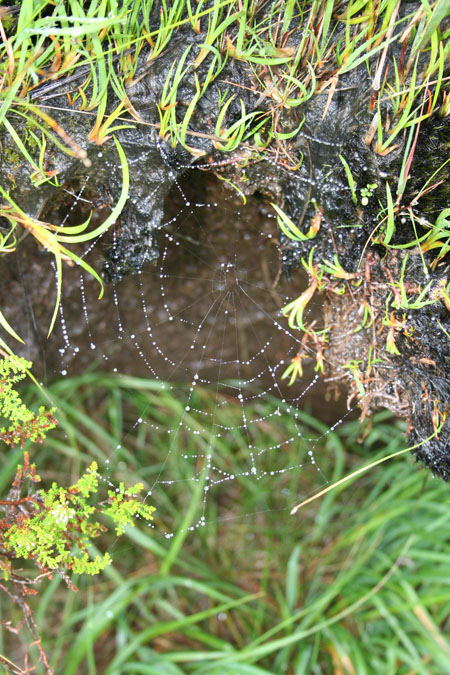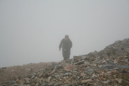 Hiking up the slope, the terrain continued to increase in steepness and treachery with soft grassy cover giving way to rocky outcrops. By the time we got up to the top, one could barely see anything b/c the cloud cover obscured any view farther than 10 feet and the wind whipped hard from the north forcing a downward, southward viewing direction (luckily which corresponded to the path). The rocks were wet from rain and we walked along the edge of the cliff with a sharp drop, plunging off into the rocky depths below…okay, maybe not that dramatic but quite foggy and quite rocky.