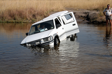 After eating lunch we turned around and tried to find out way but were continually thwarted with unpassable river channels. We eventually turned around and started heading back…along the way we saw impala, elephant, buffalo, kudu…quite nice. We came up on the third of early water passages and off went the little tracker to do it’s thing. Then the ISUZU went off the steep, short incline into the water…almost immediately we were stuck with the nose down at an angle and the truck tilted to the right side. As soon as we dropped I felt a catch in my throat and reached down towards my boots…the funny thing about being in tense situations is the things I think about first…and the first thing I thought about was how I wanted my boots off if I had to get in the water….immediately on top of that thought was the amount of electronic equipment that was sitting between us in the backseat…figures the one day we bring our computers into the field…