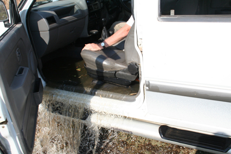 As all these thoughts are racing through my head, I also noticed the water starting to seep into the car from Daniel’s side…he was like, okay water coming in, water to my ankles, water to my knees…c’mon, c’mon…meanwhile, I’m still fumbling with my damn shoes b/c it was so impt to get them off…but, of course struggling to even get them untied…meanwhile, Narcisa, Bill, and John are all wading into the water and everyone is like get out of the car and get the stuff out…I open my back side door only to see the water reaching the level of entry…I immediately took the plunge hoping it wasn’t so deep that I’d go under..thankfully, it was only waist deep…we started a train from poor Daniel stuck in the sinking truck handing me anything and everything important, me to Narcisa to Bill to whoever would take stuff to dry land. Paul, Daniel and I all scrambled out of the truck and then out of the water…I immediately grabbed my camera and turned around for a few shots…then decided maybe helping Binford as he continued sinking might be useful.